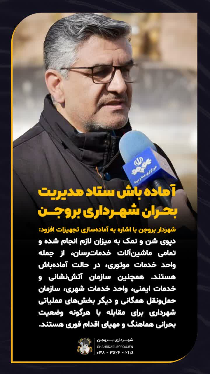 آماده باش ستاد مديريت بحران شهرداري بروجن آماده باش ستاد مديريت بحران شهرداري بروجن کد خبر: 481557 تاریخ انتشار: 1404/09/24 07:27:28نمایش: 12 اخبار آماده باش ستاد مديريت بحران شهرداري بروجن ✍️شهردار بروجن با اعلام تشکيل جلسه ستاد مديريت بحران شهرداري گفت: با توجه به پيشبيني بارش برف و باران و احتمال بروز ناپايداريهاي جوي، ستاد مديريت بحران شهرداري بروجن در آمادهباش کامل قرار گرفته است. پايش تصويري نقاط مختلف شهر بهصورت مستمر انجام ميشود و اتاق مانيتورينگ، شرايط جوي و تردد شهري را لحظهبهلحظه رصد ميکنند تا اقدامات پيشگيرانه پيش از هرگونه رخداد انجام شود. 🔸شهردار بروجن با اشاره به آمادهسازي تجهيزات افزود: «دپوي شن و نمک به ميزان لازم انجام شده و تمامي ماشينآلات خدماترسان، از جمله واحد خدمات موتوري، در حالت آمادهباش هستند. همچنين سازمان آتشنشاني و خدمات ايمني، واحد خدمات شهري، سازمان حملونقل همگاني و ديگر بخشهاي عملياتي شهرداري براي مقابله با هرگونه وضعيت بحراني هماهنگ و مهياي اقدام فوري هستند. 🔹توحيدنيا تأکيد کرد: هدف ما مديريت بهموقع شرايط، کاهش مخاطرات احتمالي و حفظ ايمني شهروندان است و مجموعه دواير شهرداري با تمام ظرفيت در آمادهباش کامل قرار دارند. روابط عمومي شهرداري و شوراي اسلامي بروجن